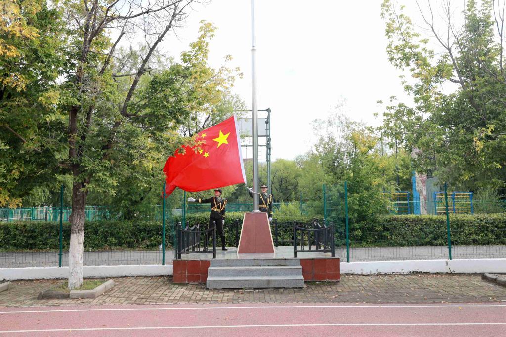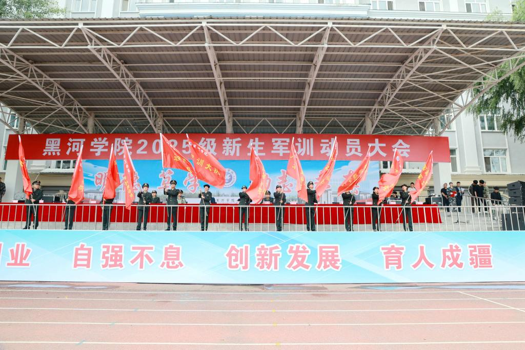 随着国歌奏响,五星红旗在运动场冉冉升起,全体人员肃立行注目礼,大会在庄严的升旗仪式中拉开序幕。带队教官随后宣读《黑河学院2025级新生军训计划》及《考核评比办法》。学校党委委员、副院长谢慧依次为各学院授"军训中队旗"。
